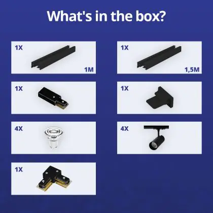 Komplettset 1-Phasen Rail L 1 x 1,5 Meter Schwarz | incl. 4x Spot + GU10 2700K 3W Dimmbar + Abschlusskappe, Stromanschluss und L -Verbinder