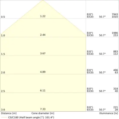 Der Abstrahlwinkel bezeichnet den Winkel, in dem das Licht aus der Lichtquelle ausgestrahlt wird. Er wird in Grad (D) angegeben. Je geringer die Gradzahl des Abstrahlwinkels ist, desto kleiner ist auch der Durchmesser des Lichtkegels, den die Lichtquelle produziert.